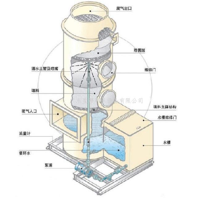 工業(yè)廢氣由風管引入噴淋水塔,經過填料層,廢氣與水及藥劑進行充分的氣液接觸,廢氣經過物理吸附及化學反應后,再經除霧板脫水除霧后由風機排入大氣。