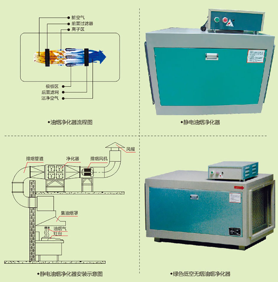 復合式靜電油煙凈化器,包括機箱外殼、除塵氣流均化裝置、靜電電場單元裝置、金屬絲網吸附組合。機箱上設有無感直流迭加脈沖高壓電源,可高效的凈化油煙,去除異味,并且提高了使用的安全性。其工作原理為:油煙空氣經過特制的S型擋板,均衡慣性碰撞分離‘去除粗大油煙顆粒,進入高壓靜電場,使通過的油霧粒子大量的吸附在集塵板上,再經過模塊化金屬絲網及活炭過濾吸附組合,去除最后的剩余物質及異味,排出凈化后的潔凈空氣。