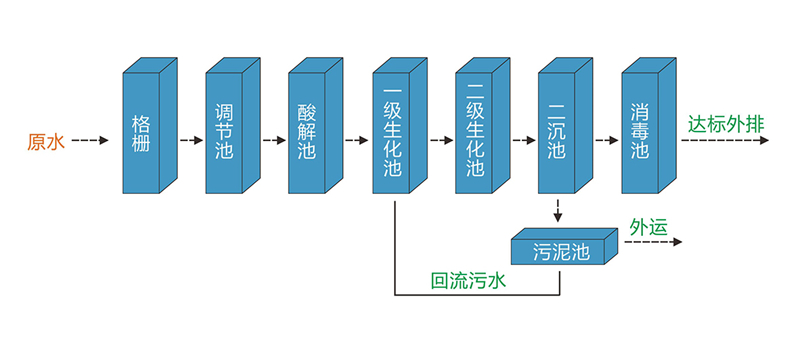 生活污水處理一般采用先進成熟的A/O+MBR污水處理工藝,該工藝相對于傳統(tǒng)工藝突出特點是出水穩(wěn)定,受季節(jié)性影響小,處理設備占地面積大大減少,加之池中填充新型彈性立體填料,大大優(yōu)化微生物組成結構與數量,提高整個系統(tǒng)有機物負荷,克服了傳統(tǒng)推流式工藝抗沖擊負荷能力不強的問題,大大降低污泥產泥量,從而使廢水穩(wěn)定達標排放。